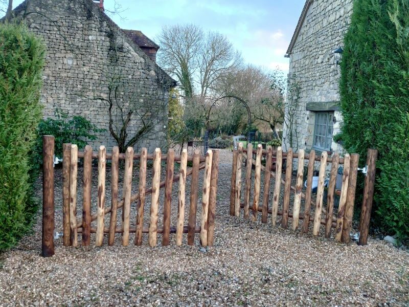 Das Portal "Champêtre" ist freundlich und hat ein robustes Aussehen. Es ist aus Kastanienrundhölzern handgefertigt. Das ländliche Tor hat den gleichen Rahmen wie das französische Tor, außer dass die runden Hälften (Verkleidung) breiter sind (6-8 cm). Es kann perfekt mit der Pfette kombiniert werden. Es steht in Harmonie mit der Natur.