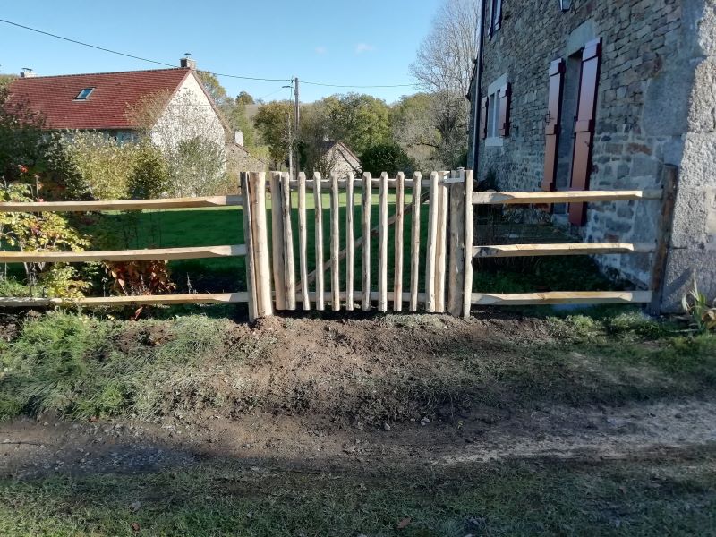 Das Portal "Champêtre" ist freundlich und hat ein robustes Aussehen. Es ist aus Kastanienrundhölzern handgefertigt. Das ländliche Tor hat den gleichen Rahmen wie das französische Tor, außer dass die runden Hälften (Verkleidung) breiter sind (6-8 cm). Es kann perfekt mit der Pfette kombiniert werden. Es steht in Harmonie mit der Natur.