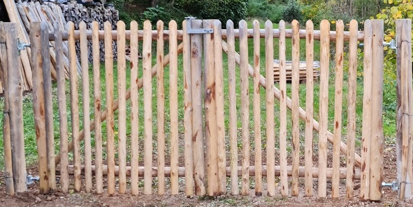 • Alle Rundhölzer sind mit Zapfen und Zapflöchern (Schlitz und Zapfen) verbunden. Die Staketen werden mit Edelstahlschrauben montiert. Der Standardabstand zwischen den Staketen beträgt 4–5 cm. Die Breite der halbrunden Staketen beträgt 4–5 cm.