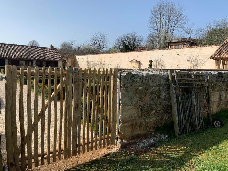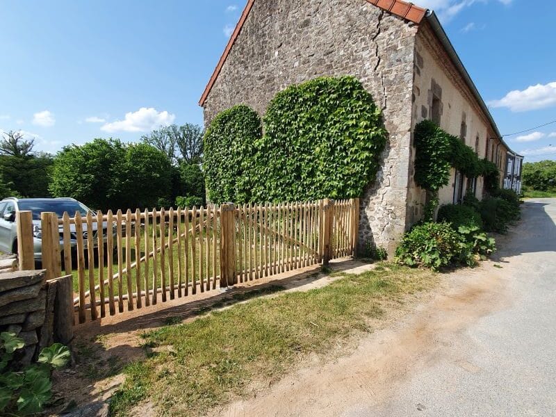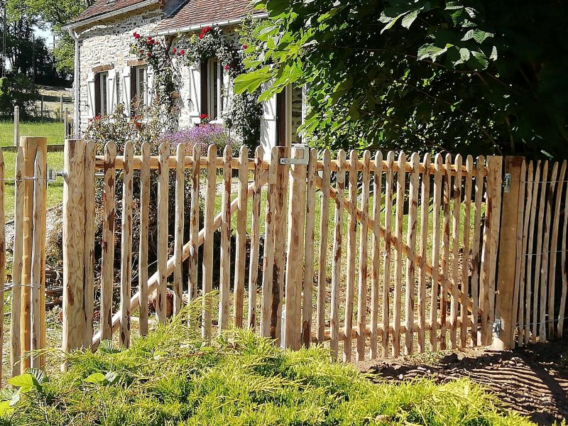 Das französische Tor ist freundlich und rustikal, es ist ein sehr schöner Eingang zu Ihrem Garten oder Gemüsegarten. Es ist handgefertigt, der Rahmen ist aus Kastanienholz und mit rustikalen halbrunden Stelzen, ebenfalls aus Kastanienholz, verkleidet. Der Franzose eignet sich perfekt für die Kombination mit Pfahlwinden. Er harmoniert mit der Natur.