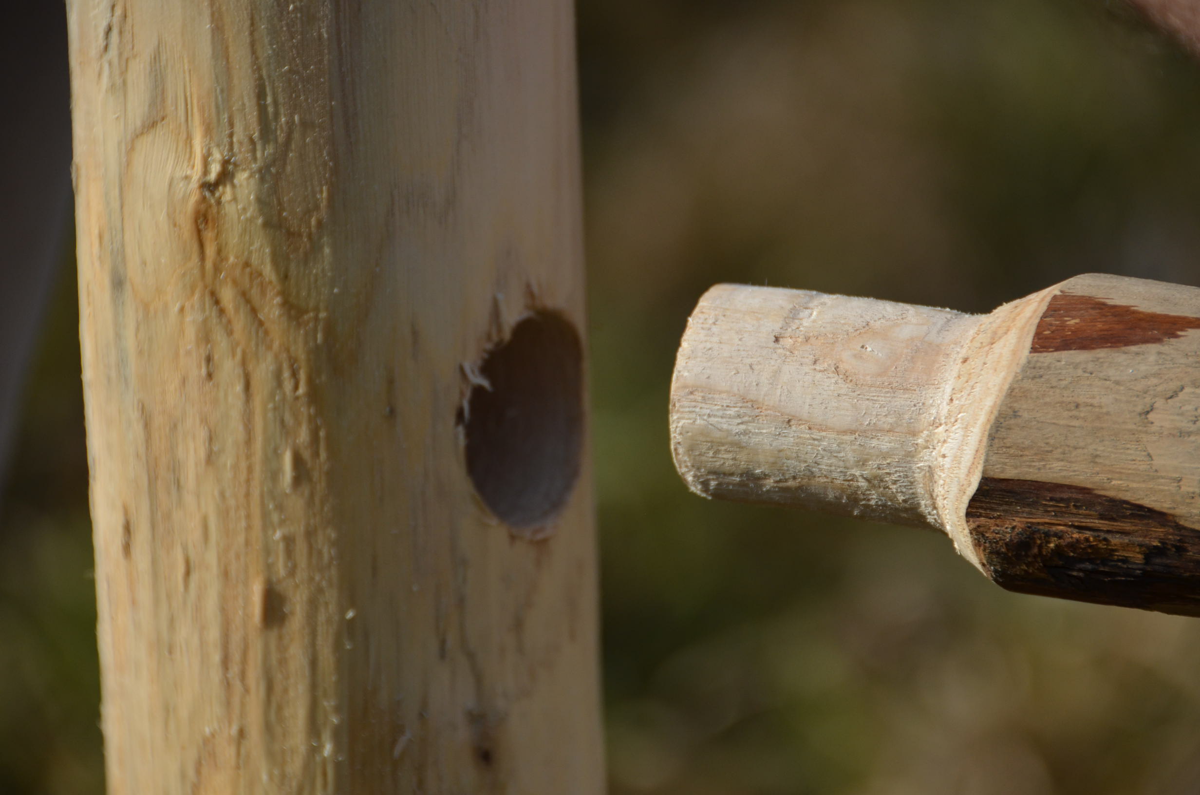 - Alle Rundhölzer sind mit Zapfen und Löchern (Zinken und Zapfen) verbunden.