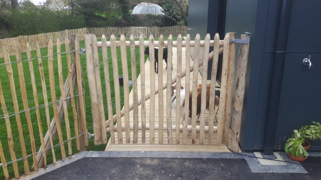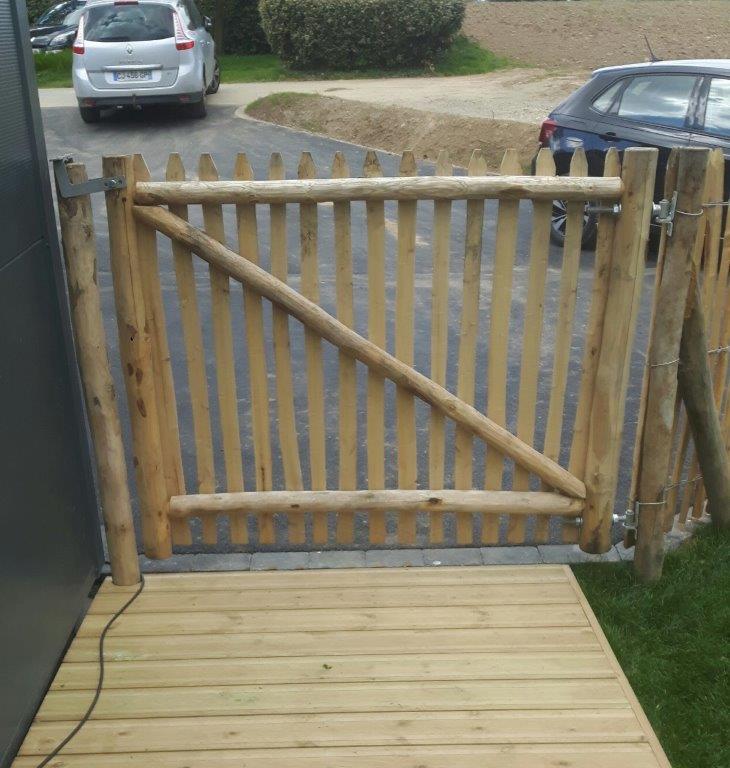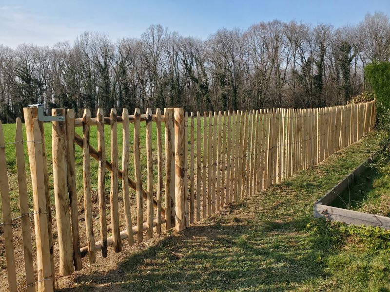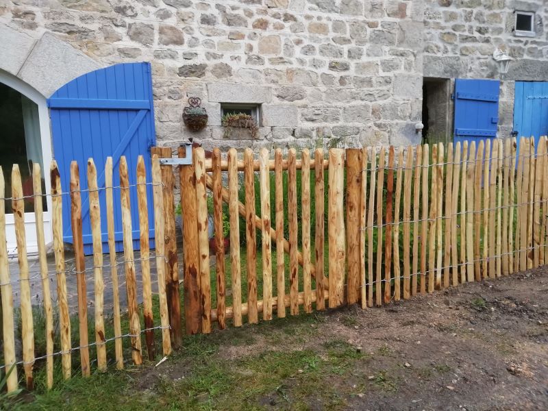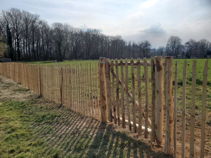 Das französische Tor ist freundlich und rustikal, es ist ein sehr schöner Eingang zu Ihrem Garten oder Gemüsegarten. Es ist handgefertigt, der Rahmen ist aus Kastanienholz und mit rustikalen halbrunden Stelzen, ebenfalls aus Kastanienholz, verkleidet. Der Franzose eignet sich perfekt für die Kombination mit Pfahlwinden. Er harmoniert mit der Natur.