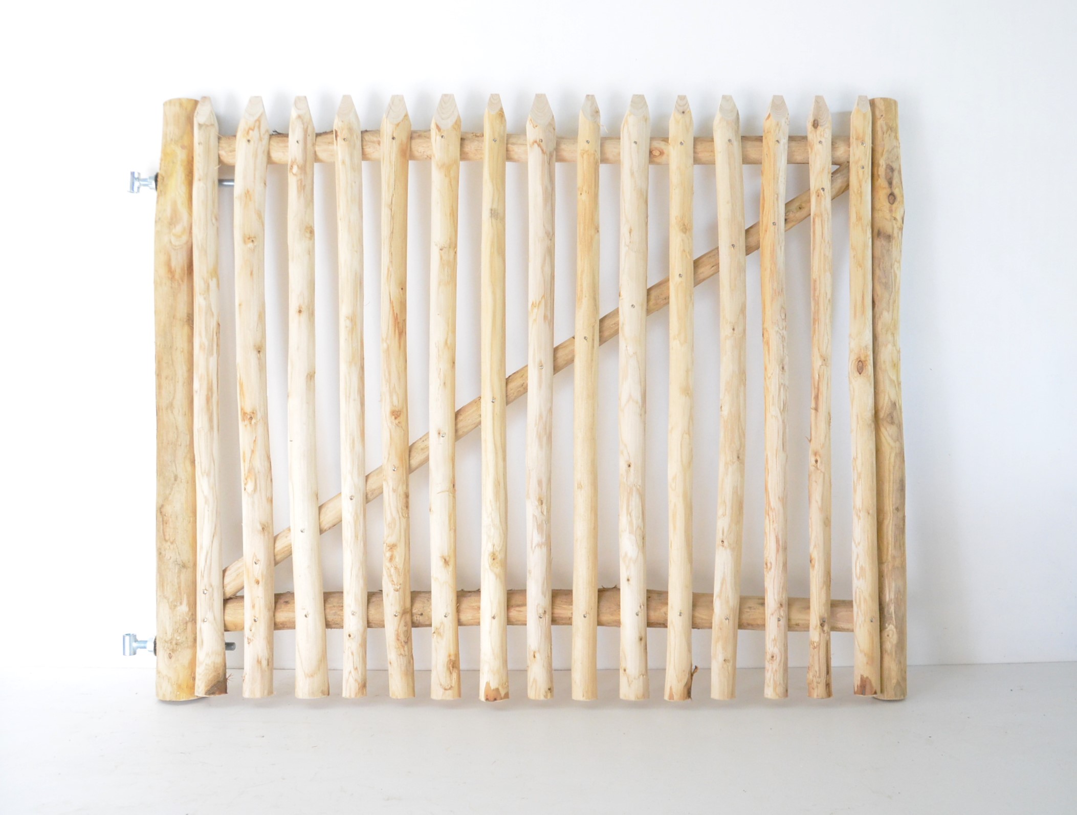 - Alle Rundhölzer sind mit Zapfen und Zapflöchern (Schlitz und Zapfen) verbunden. Die Staketen werden mit Edelstahlschrauben montiert. Der Standardabstand zwischen den Staketen beträgt 4–5 cm. Die Breite der halbrunden Staketen beträgt 4–5 cm.
